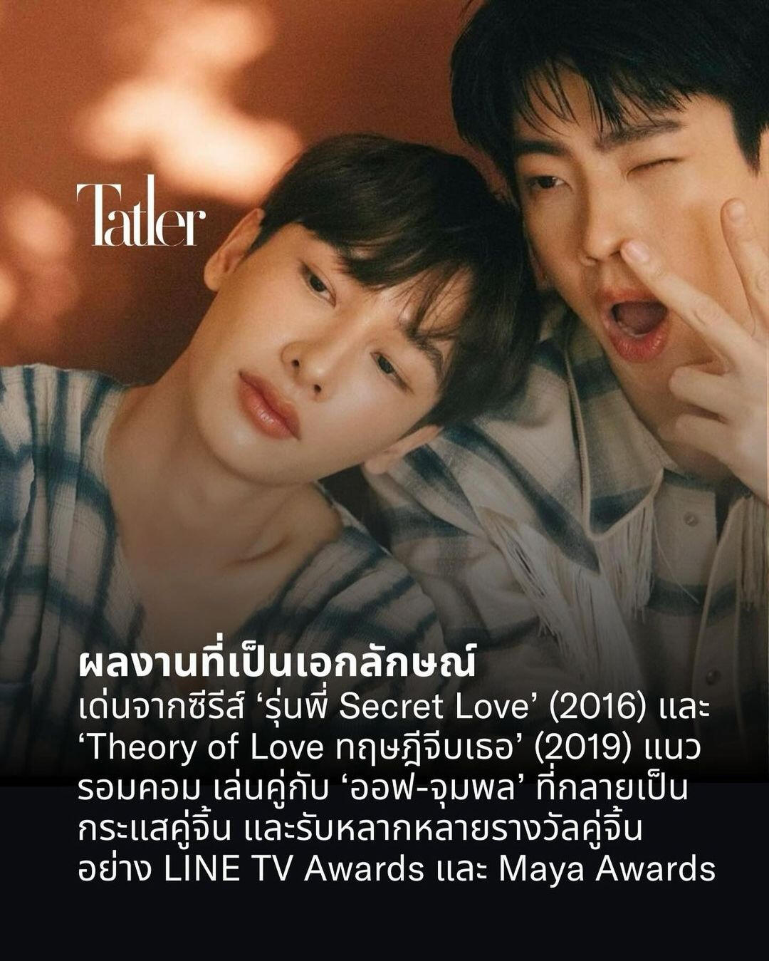 If we count the pair's series from the first time they met in Senior Secret Love: Puppy Honey until their currently airing series, The Trainee, Off Jumpol Adulkittiporn and Gun Atthaphan Phunsawat's journey in the entertainment industry has been 8 years already.Off told Tatler, "We didn't dream of becoming this famous, but once we gained recognition, we had to maintain it as best as we could and that is more difficult."Every time they accept new roles, both of them say they'll try their best and maintain the same standards. This is probably the reason why Off-Gun have loyal fans while their series is always popular.Aside from this, the pair's dressing styles are different, but blend well when they're together. Thus they were chosen to be one among Tatler's Asia's Most Stylish 2024. This time we had an opportunity to chat with the pair about their dressing styles, fashion interests, and lessons they've learned all throughout their 8 years in the entertainment industry.