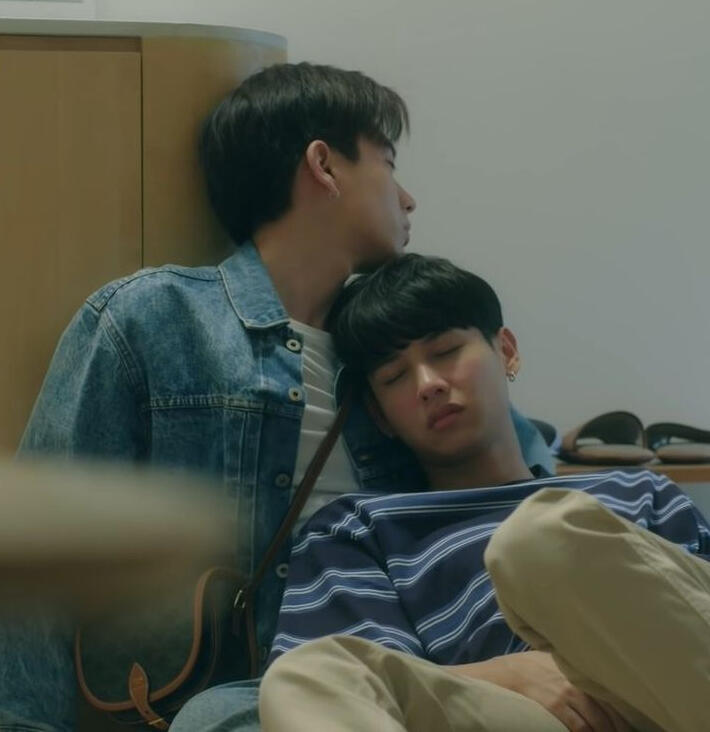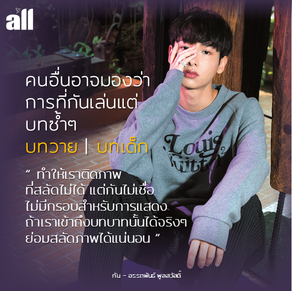 This question is not related to whether the character being played by Gun must be gay, but let me give you comparative examples. Mario was recognized from The Love of Siam. Everyone remembered Mario in his gay role and after that, Mario never played a gay role again because he was afraid that people would be stuck to that image. And today, the image of Mario went a different way. Or in the case of March Chutavuth, who was recognized from a gay role - although March went to play another movie that was male-female, everyone was stuck to that image that March = gay role. So the thing I'm asking is if you are worried with what you're stuck with in the future? "I just think it's acting. But am I worried? There are some people who would associate me to this image forever, but I think that if a good role comes, no matter if it's a gay role, I'm okay with it. I'd play it if it's really good."